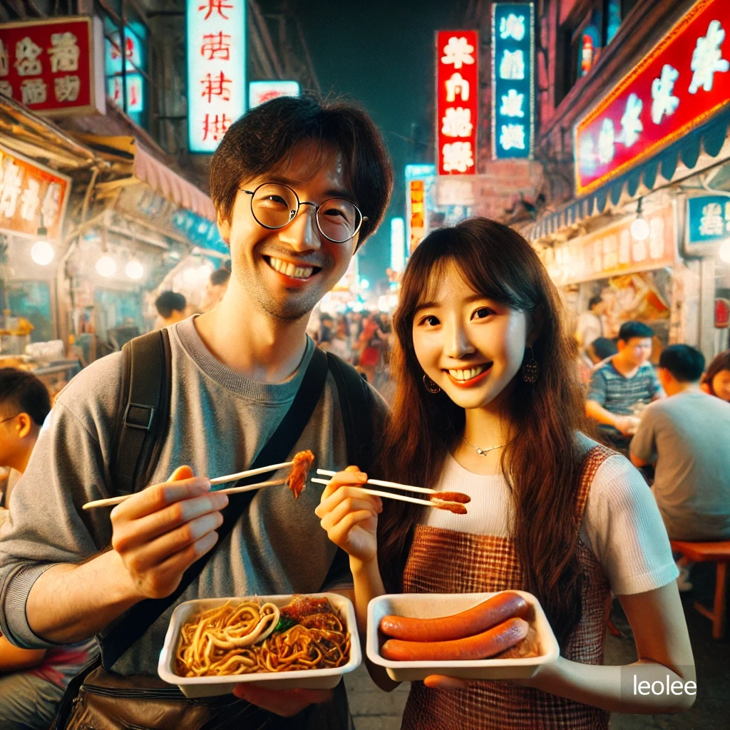 타이동 먹자골목의 활기찬 거리에서는 다양한 음식을 맛볼 수 있었는데, 그곳에서 우리는 대만소시지와 꼬치구이를 즐기고, 벨라가 추천해 준 카오렁미앤(烤冷面)도 먹어보았다.
