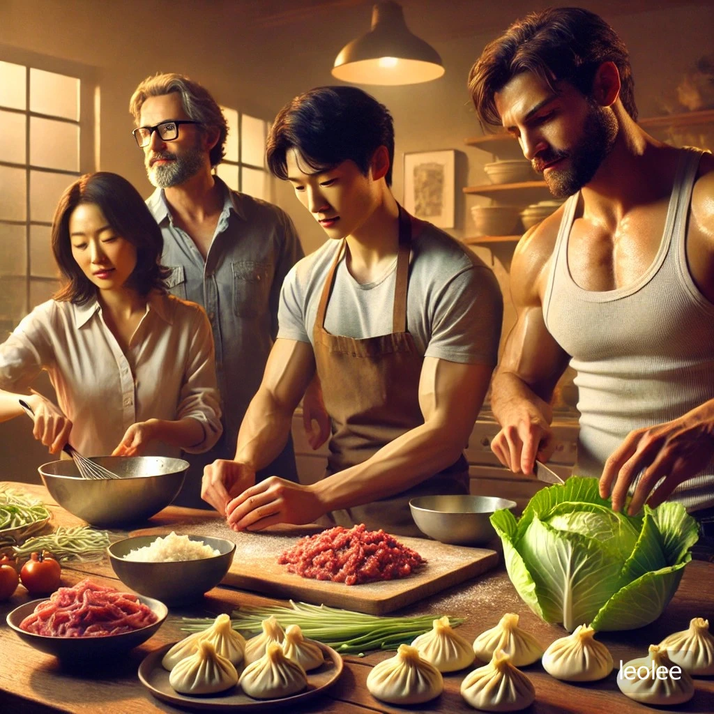 만두를 만들기 위해 모두 부엌으로 모였다. 부인은 배추와 돼지고기를 준비하며 말했다.