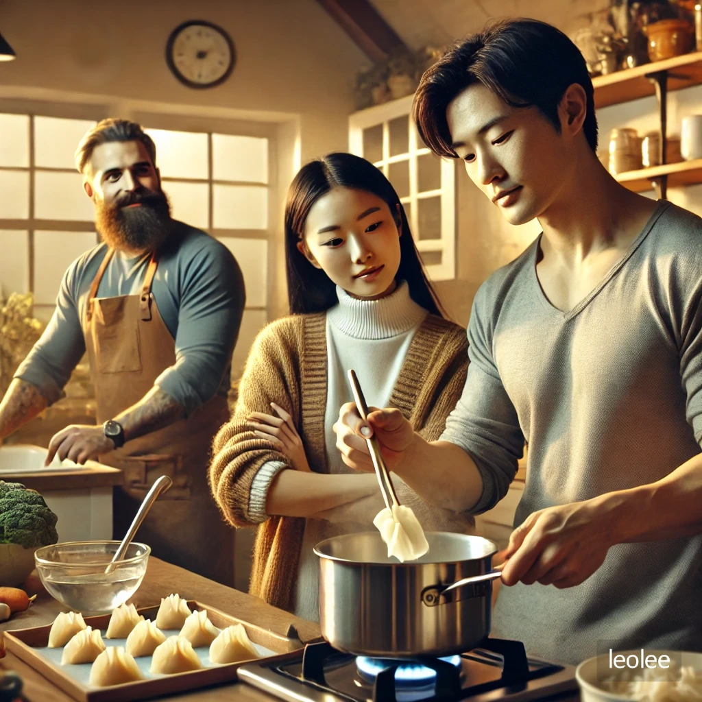 만두를 모두 빚은 후, 부인이 끓는 물에 만두를 넣기 시작했다. 나는 물어봤다.