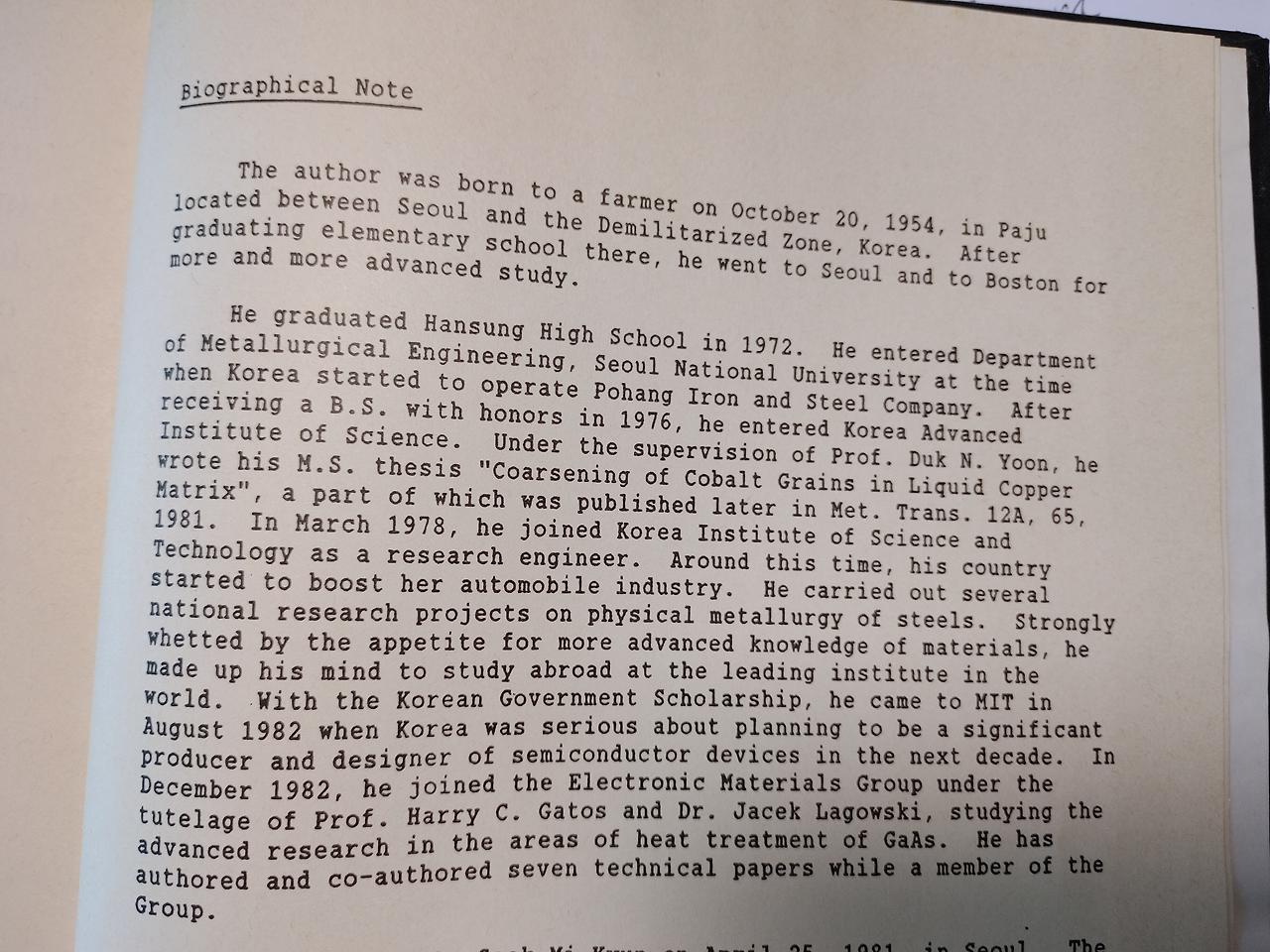 "필자는 1954년 10월 한 농부의 아들로 한국의 서울과 휴전선 사이에 있는 파주에서 태어났다. 거기서 초등학교를 졸업한 후 그는 상급학교 공부를 위하여 서울로 계속하여 보스턴으로 갔다. 그는 1972년 한성고등학교를 졸업하였다. 한국이 포항제철 회사를 가동하기 시작할 즈음에 국립서울대학교 금속공학과에 입학하였다. 1976년 공학사 학위를 우등으로 받은 후에 한국과학원에 들어갔다. 윤덕용 교수님의 지도로, ‘액상 구리 기지 상에서 코발트 입자의 성장’이라는 제목의 석사 학위 논문을 썼는데, 내용 중의 일부는 뒤에 미국 금속 학회지(Met. Trans. 12A, 65, 1981)에 출판되었다. 1978년 3월에 한국과학기술연구소에 연구원으로 들어갔다. 이즈음에 그의 나라는 자동차산업을 일으키기 시작하였다. 그는 강철의 물리 야금에 관해서 몇 개의 국가 연구과제를 수행하였다. 재료에 관한 선진 기술에 대한 욕구에 강력하게 이끌리어 그는 세계적인 선도 기관에서 공부하기로 마음먹었다. 한국 정부의 장학금을 갖고 1982년 8월에 MIT로 왔는데, 그때는 한국이 다음 세대에 중요한 반도체 생산자와 개발자가 되려는 계획을 심각하게 생각하고 있었다. 1982년 12월에 Harry C. Gatos 교수와 Jacek Lagowski 박사가 이끄는 전자재료연구실에 합류하여 GaAs의 열처리 분야에서 선도적인 개발에 관한 공부를 하였다. 그는 연구실의 일원으로 있으면서 7개의 기술 논문을 쓰거나 공동으로 집필하였다."