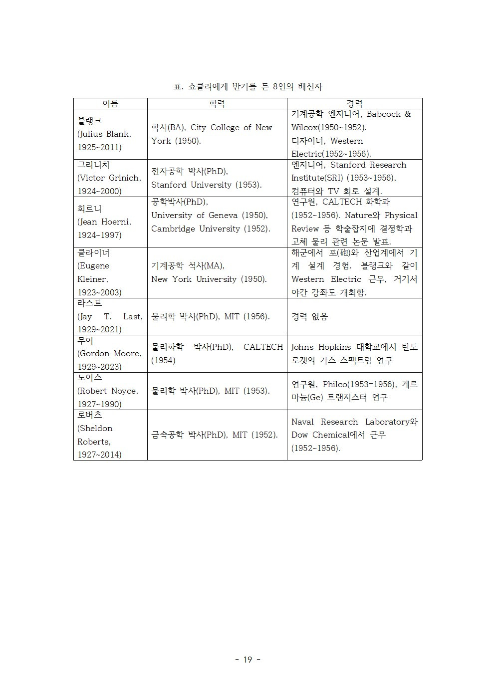 1957년 말, 쇼클리 반도체회사에 있던 연구원 8명이 회사를 그만두고, 페어차일드(Fairchild Camera and Instrument) 회사로 옮겨가서 반도체 사업부를 만들었고, 쇼클리는 이들은 배신자들이라고 비난했다. 이들 '8명의 배신자(traitorous eight)'는 블랭크, 그리니치, 회르니, 클라이너, 라스트, 무어, 노이스, 로버츠 등이었다. 이들의 나이는 당시 26세에서 33세로서 그야말로 열혈청년들이었다. 당시 이들의 학력과 경력을 다음 표에 정리하였다. 이 중 6명이 박사(PhD)였다. 이 중에서 회르니가 경험 있는 과학자였고 유능한 관리자였다. 노이스만이 반도체(semiconductor) 연구에, 그리니치만이 전자공학(electronics)에 경험이 있었다.