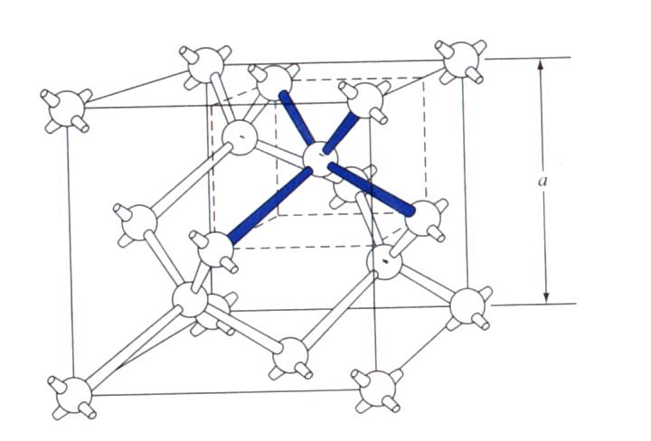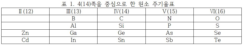 표 1에 4족 혹은 14족에 속해 있는 원소 반도체를 중심으로 주위에 있는 원소 일부를 보였다. 원소 반도체는 상온에서 고체인 결정을 이루는데, 원자의 배열 방법은 3차원 공간에서 그림 1과 같다. 원자는 그 중심에 양(+) 전기를 띠고 있는 원자핵이 있고 주위에 음(-) 전기를 띠고 있는 전자가 원자번호의 수만큼 존재한다는 것이 현대 과학의 이해이다. 원자는 대부분 비어 있다고 보는데 그림 1에서는 각 원자가 영향을 미치는 영역을 원으로 표시하였고 이웃 원자와 결합하고 있다는 점을 보이기 위하여 막대로 연결하였다. 각 원자는 네 개의 이웃 원자와 결합하고 있다. 이러한 구조의 결정을 다이아몬드 입방체(Diamond Cubic; DC)라고 부른다. 그림 1에서 각 원에 해당하는 원소가 탄소로 되어 있으면 다이아몬드이다. 다이아몬드는 이 세상에서 가장 강한 재료로 알려져 있는데, 탄소 원자끼리 강한 방향성 공유결합력(covalent bonding force)으로 연결되어 있어서 그 고리를 깨기가 가장 어렵기 때문이다. 그 결합력은 주기율표에서 밑으로 내려갈수록 즉 주기가 늘어날수록 약하여진다.