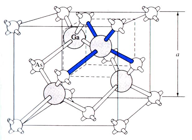 GaAs, InP와 같은 일부 화합물 반도체 재료도 다이아몬드 입방체 구조를 이루고 있다. 두 개의 구성 원소의 크기가 다르므로 별도로 Zinc Blend 구조라는 이름으로 부르기도 한다. GaAs 결정을 대상으로 구조를 표시하면 그림 3과 같다. Ga 원자와 As 원자가 별도로 FCC 구조를 이루며 서로 끼어져 있다. Ga 원자는 4개의 As 원자와 이웃을 이루고 있고, As 원자는 4개의 Ga 원자와 이웃하고 있다.