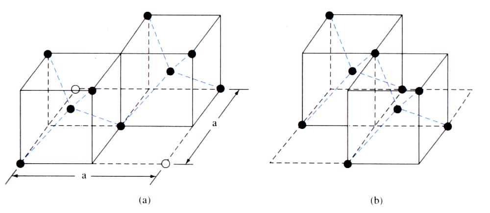 다이아몬드 결정 구조를 분리해 생각해 보면 그 구조의 이해가 쉽게 될 수 있다. 그림 1의 다이아몬드 결정 구조는 그림 2의 왼쪽 그림 위에 오른쪽 그림이 얹혀 있다고 볼 수 있다. 즉 그림 1의 다이아몬드 결정 구조는 네 개의 사면체(tetrahedron)로 이루어져 있다는 사실을 알 수 있다. 다른 측면에서 보면 다이아몬드 결정 구조는 면심입방(Face Centered Cubic; FCC) 구조가 서로 겹쳐있는(interpenetrating) 구조이다. 다이아몬드 입방체에서 구성 원자가 공간을 채우는 비율은 34%밖에 안 된다. 참고로 면심입방체(FCC)나 육각 조밀 충전(HCP) 구조의 원자충전율(atomic packing factor)은 74%, 체심입방체(BCC)의 그것은 68%이다. 다이아몬드 입방체를 구성하는 4족 원소들은 상온에서 34%밖에 채워지지 않은 고체이다. 이렇게 낮은 원자충전율을 보이는 다이아몬드 입방체를 갖고 있는 4족 원소들이 이차전지의 좋은 음극 재료로 고려되고 있는 이유이다. 즉 방전 시에 리튬(Li) 원자(이온)가 음극으로 들어갈 때 원자충전율이 작은 재료가 유망하다.
