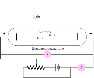 위 그림에서 진공으로 만든 석영관 안에는 두 개의 전극이 있다. 왼쪽 전극이 양(+), 오른쪽 전극이 음(-)이 되도록 직류인 전지(배터리)가 연결되어 있고 가변저항을 조절하여 두 전극 사이의 전압에 변화를 줄 수 있고, 전압계(V)를 달아 전압을 측정한다. 금속으로 된 양(+) 극판 위에 빛을 쪼여주면 빛을 받아서 나온 광전자 중 일부는 충분한 에너지를 가져서 음극 금속판이 음(-)으로 대전(帶電)되어 있음에도 불구하고 척력을 이기고 음극판에 도달하게 된다. 이로 인해 전체 회로에 전류가 흐르고 있음을 전류계(A)로 측정할 수 있다. 가변저항을 작게 하면 두 전극 사이의 전압이 크게 걸리게 된다. 이 경우의 전자는 거센 물결을 헤엄쳐 오르는 연어와 같은 처지가 된다. 빛으로부터 에너지를 공급받은 전자들이 역방향의 큰 전기장을 이기지 못하면 음극에 도달하지 못하게 된다. 수 볼트 정도인 어떤 특정 전압까지 전압을 높이면, 음극에 도달하는 전자는 하나도 없고 전류는 0이 된다. 이 임계전압을 소멸전압이라고 부른다. 소멸전압은 광전자의 최대 운동에너지와 대응된다. 빛은 에너지를 갖고 있으며, 금속에 흡수된 에너지는 각개의 전자에 모이게 되고 전자의 운동에너지로 다시 나타난다는 것이 고전물리학의 해석이었다. 그러나 다음 세 가지 실험 결과는 고전물리학으로 쉽게 설명이 되지 않는다. 첫째, 빛이 금속에 도달하자마자 광전자가 방출된다. 둘째 같은 진동수에서 밝은 빛은 어두운 빛보다 더 많은 광전자를 방출하기는 하나, 전자의 에너지는 모두 같다. 셋째 빛의 주파수가 높을수록 광전자는 더 큰 에너지를 갖는다.