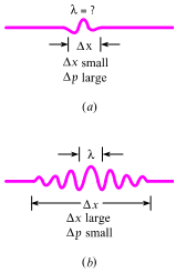 움직이는 입자를 파군 혹은 파속으로 여긴다는 것은 위치나 운동량 같은 입자의 성질을 나타내는 물리량을 측정하는 데 있어서 그 정확도에 원리적인 한계가 있다는 것을 암시한다. 아래 그림과 같은 두 종류의 파군을 생각해 보자. 입자는 주어진 시간에 파군 안의 어디에든 있을 수 있다. 물론 입자가 발견될 확률밀도는 군(群)의 중심에서 최대가 되므로 군의 중심에서 입자가 발견될 확률이 최대가 될 것이다. 그렇지만, 확률밀도가 실제로 0이 아닌 어디에서든 입자는 발견될 수 있다. 아래 그림의 (a)처럼 파군이 좁아지면 좁아질수록 그 입자의 위치를 더욱 정확히 나타낼 수 있다. 그러나 좁은 파군에 있는 파의 파장은 명확히 정의되지 않는다. 파장(λ)을 정확히 측정할 만큼의 충분한 파의 개수가 없기 때문이다. 이는 드브로이의 식 λ = h/p = h/mv에서 입자의 운동량 p가 정밀한 양이 아니라는 의미이다. 이 경우 입자의 운동량을 측정하면 오차범위가 넓은 값을 얻게 된다. 한편, 아래 그림의 (b)에 있는 넓은 파군에서는 파장을 정의하기가 훨씬 쉽다. 즉 파장을 측정하는데 오차 범위가 줄어든다. 명확한 파장에 대응하는 운동량은 정밀한 양이 되며 측정한 운동량 값은 오차 범위가 적은 값이 된다. 그러나 입자는 어디에 위치할까? 파군의 너비가 너무 커서 주어진 시간에 입자가 어디에 있는지 정확히 특정하기가 어렵게 된다. 즉 위치 측정의 오차가 커진다.