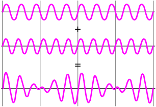 움직이는 입자에 대한 파동적 표현은 파속(波束, wave packet) 혹은 파군(波群, wave group)으로 나타나며, 이를 구성하는 파들의 진폭이 그 입자를 발견할 확률에 관계된다. 파군은 어떻게 생기는가? 잘 알려진 예는 소리의 맥놀이(beat) 현상이다, 진폭이 같고 진동수가 조금 다른 두 개의 음파가 동시에 발생하면 서로 간섭을 일으켜서 들리는 소리의 진동수는 원래의 두 진동수의 평균이 되고 진폭은 주기적으로 오르내린다. 예를 들어, 원래 두 소리의 진동수가 220Hz와 222Hz라면 우리 귀에는 진동수가 221Hz인 소리가 1초 동안에 두 번씩 세기의 정점에 도달하는 맥놀이로 들린다. 이 맥놀이의 발생을 파형으로 아래 그림에 나타내었다. 아래 그림에서 두 번째 및 세 번째 칸에 표시된 파형이 우리 귀에 연속적으로 들린다. 어떤 기악 연주곡을 들으면 두세 가지 악기에서 나는 음들이 beat 현상을 일으켜 어떤 주기성을 갖고 반복된다. 어떤 소리의 파군이 흐르고 있다고 볼 수 있다.