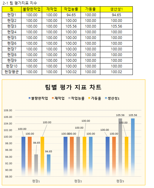 현장 1은 자재관리가 되지 않는 현장이다. 생산성 100을 기준으로 94.65%이다.