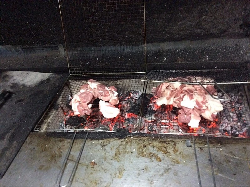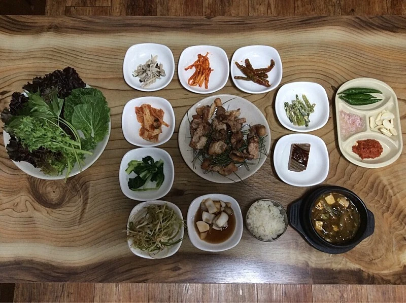 솔잎 향을 잊혀 숯불에 구워낸 돼지고기를 주문하면 쑥갓, 상추, 당귀 등 신선한 쌈 채소, 버섯, 도라지무침, 양념 무침 한 찐 고추, 고소한 콩가루로 무쳐 쪄낸 달금한 마늘종, 도토리묵, 고추, 짭짤한 감칠맛의 새우젓, 마늘, 된장, 시큼한 묵은 김치, 데친 배추, 심심하게 무친 파무침, 양파 간장 등 밑반찬이 한 상 차려진다. 돼지 숯불구이를 쌉쌀한 당귀잎에 싸 먹는게 특히 맛깔나다.
