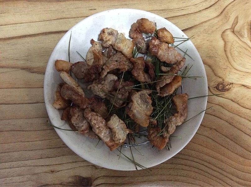 솔잎 돼지 숯불구이는 바삭하게 익은 부분도 있고, 적당히 기름기 빠진 부위도 있다. 고소하고 부드러운 비계와 촉촉하고 졸깃한 살코기등이 적절하게 섞인 도톰한 숯불구이다. 소금을 뿌려 간도 맞추고 감칠맛도 끌어 올렸다. 소나무 숯불과 솔잎은 풍미를 더하고 돼지고기는 기름을 뺐다. 더하고 뺀 먹거리는 먹는이의 오감을 기껍게 한다.