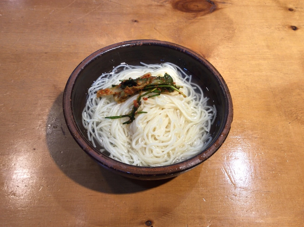 아삭하고 풋풋한 얼갈이배추 겉절이를 얹어 먹는다. 매콤한 양념과 식감이 달큰한 설탕물, 졸깃한 면과 잘 어우러진다. 면을 다 먹은 후 남은 설탕물을 들이켠다. 단맛이 진하다. 달콤하다.