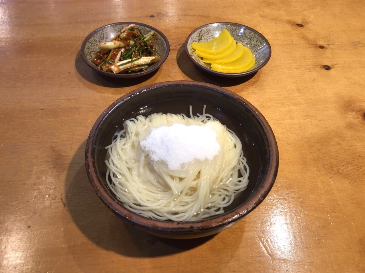 설탕국수를 주문한다. 묵직한 뚝배기에 생수 물, 일반 면보다 약간 굵어 보이는 면을 삶아 넉넉하게 담고 설탕을 얹어 내준다. 아삭하게 씹히는 부추 넣은 얼갈이배추, 새곰한 단무지를 곁들여 먹는다.