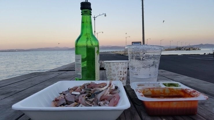 전어 여섯 마리 만 원에 초장까지 준다. 득량, 율포 쪽 전어는 양식하지 않은 자연산 전어라고 한다. 인근 슈퍼서 소주 한 병과 얼음을 사 방파제 의자로 향한다.