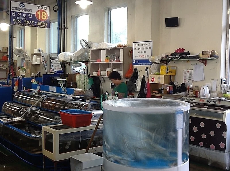 선진수산은 보성 율포항 회천수산물위판장 18번 중매인이 운영하는 곳이다. 철마다 잡히는 수산물을 맛볼 수 있다. 둥그런 수조를 활기차게 돌고 있는 전어를 산다.