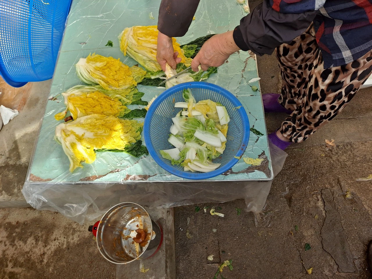 어머니는 집 텃밭에서 기른 배추는 '산 배추'고 판매하는 절인 배추는 '죽은 배추'라고 부른다. 김장하기 위해 '산 배추'를 소금에 절여 둔다. 그중 일부를 겉절이로 담근다.