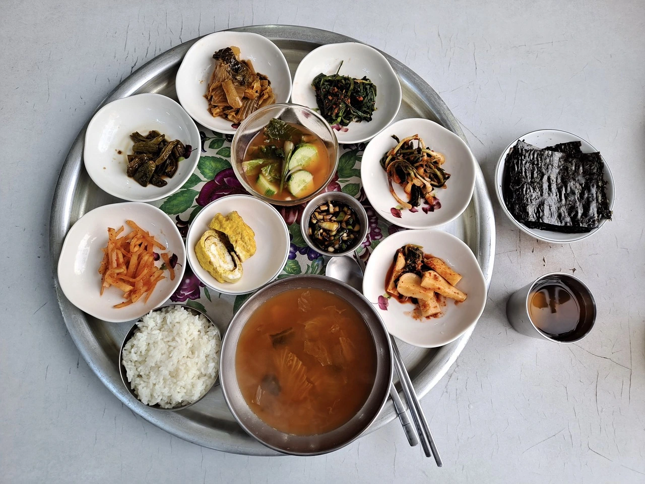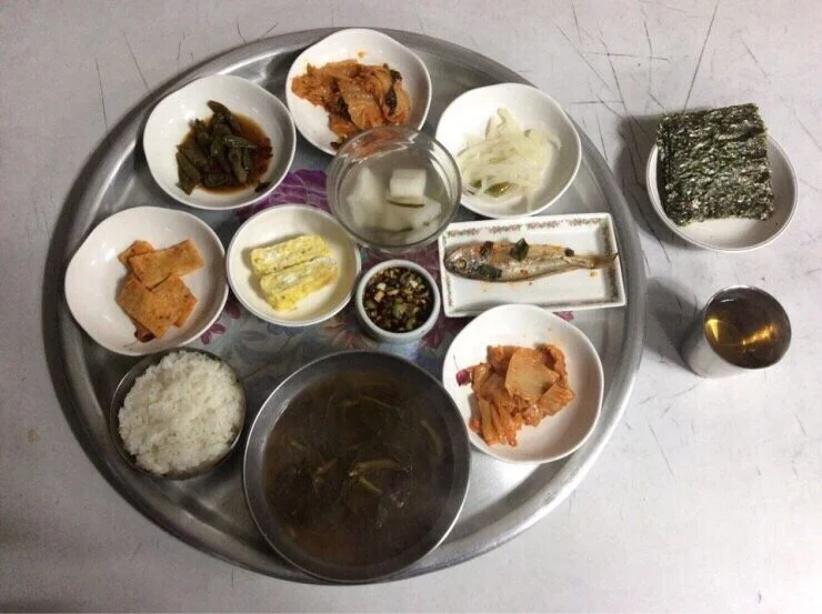 아욱국 백반을 주문하고 따뜻한 보리차로 추위를 달랜다. 잠시 후 주인 할아버님이 둥그런 상에 국과 밥, 평범하지만 다양한 밑반찬을 담아 내온다.