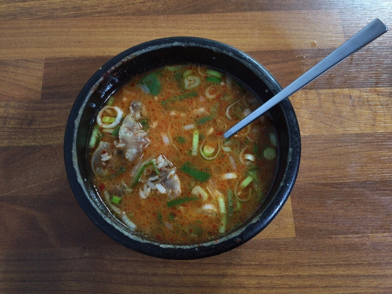 맑은 국물을 다 먹어서 추가로 부탁드렸더니 다른 뚝배기에 대파를 얹어 한가득 담아 내준다. 국물을 붓고 다진 양념장을 숟가락으로 살살 풀어 맛본다. 삼삼하고 구수한 국물에 얼큰함과 칼칼함이 더해진다. 살짝 따로 맛보았을 때의 짠맛은 덜하다. 지복점을 찾는 과정은 개인의 선택이다.