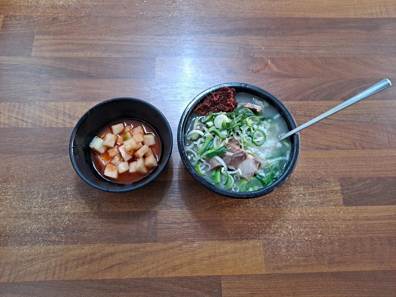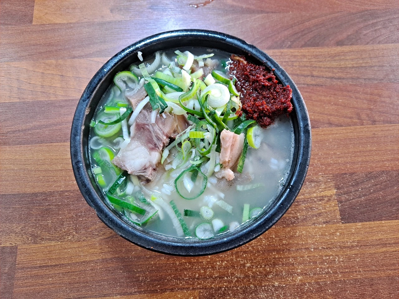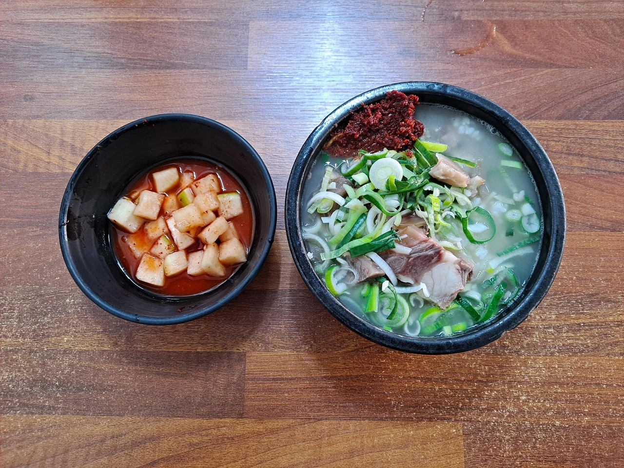 밑반찬은 새곰하고 시원한 국물과 아삭한 식감의 작게 썬 깍두기 하나다. 젓가락이 필요없다. 숟가락만으로 식사가 가능하다. 부족함이 느껴지지 않는다.