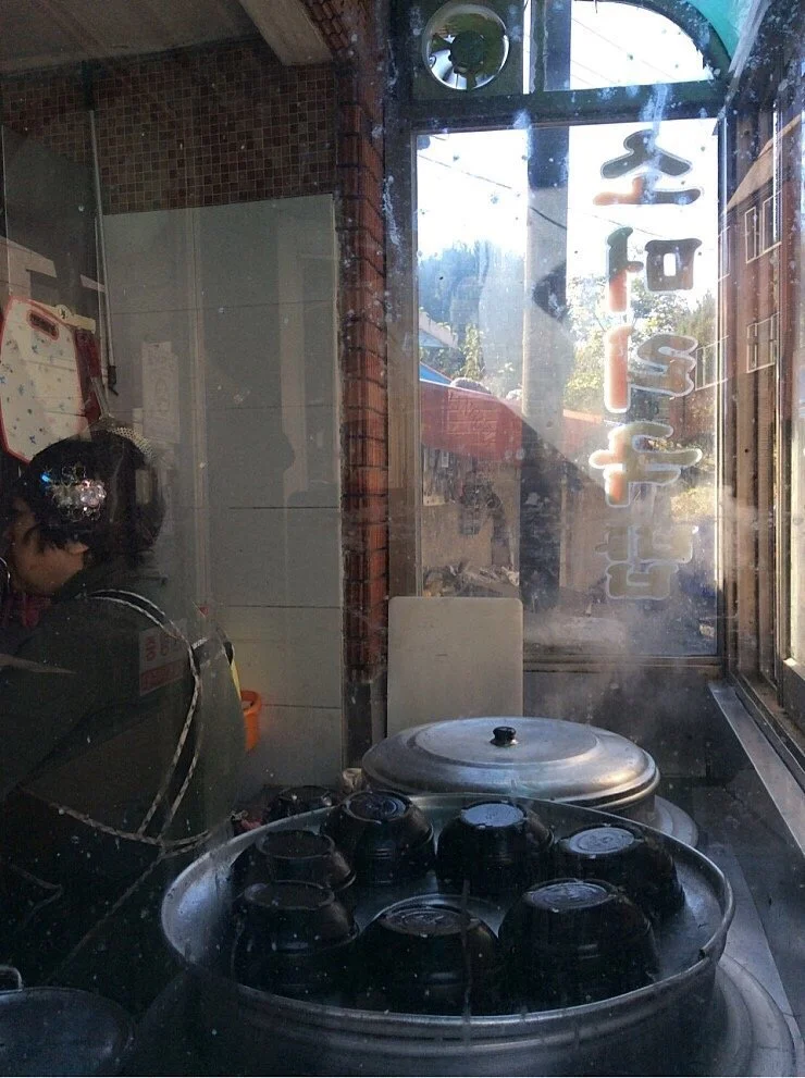 부엌 모서리 따뜻한 곳에서 어머님이 잠시 쉬고 계신다. 국밥이 끓는 솥 위엔 검은 뚝배기가 데워지고 있다. 하얀 수증기가 오르는 뒤쪽으로 소머리국밥 글씨가 거꾸로 보인다.