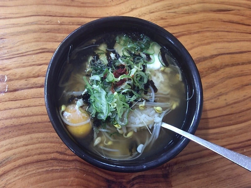 콩나물국밥은 약간의 다진양념, 김, 파, 고춧가루와 국물 맛을 유지하기 위해 달걀흰자와 노른자를 터트리지 않고 따로 분리해 얹는다. 탱글탱글하게 살아 있는 달걀노른자는 취향에 따라 풀어 먹거나 반숙 형태로 먹을 수 있다.