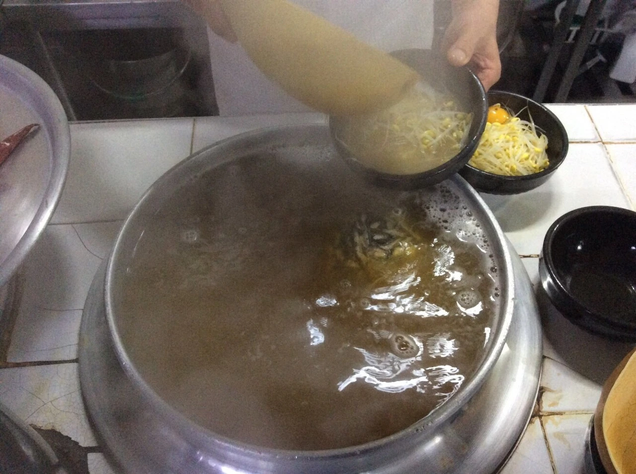 콩나물국밥을 주문한다. 식힌 밥과 쪄낸 가는 콩나물을 담은 뚝배기를 왼손으로 비스듬하게 잡고 망에 통멸치를 넣어 우려낸 진한 갈색의 육수를 표주박에 담아 토렴을 서너 번 반복한다.