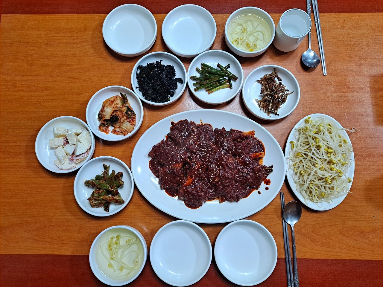 명태갈비를 주문하면 여사장님이 즉석에서 반건조한 명태를 쪄 갖은양념을 얹은 후 하얀 접시에 담고 살짝 데친 콩나물과 함께 내준다. 사과샐러드, 김치, 마늘종 무침, 멸치무침, 고추찜, 김무침, 콩나물국 등 수수하지만 솜씨 좋은 밑반찬도 곁들여 내준다.