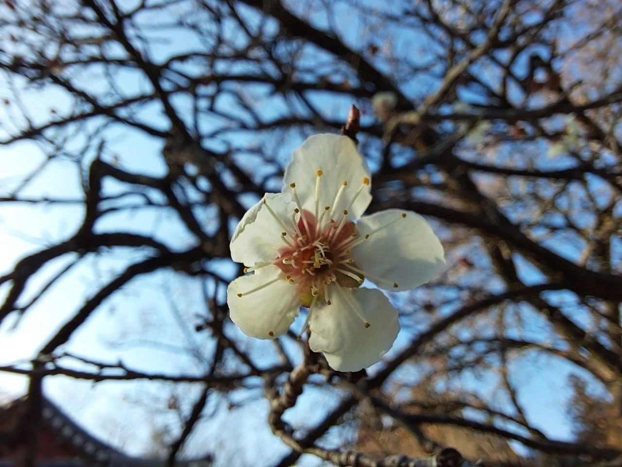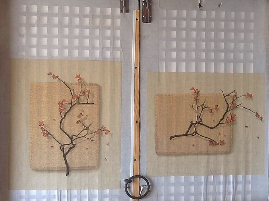 물 가지러 갔다가 우연히 부엌 입구 문창에서 홍매화 자수를 만났다. 매화나무 가지에 핀 빨간 꽃망울이 금방이라도 터질듯하였다.