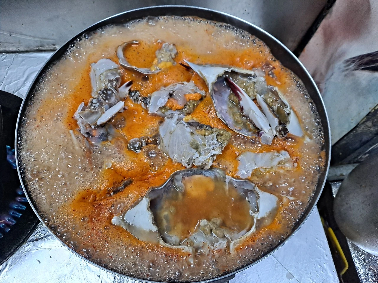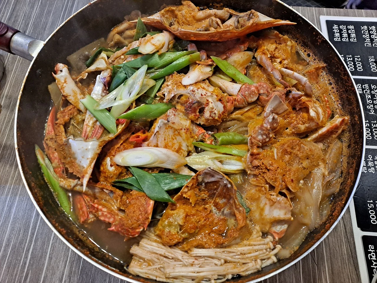 꽃게탕은 백합, 가리비, 홍합, 동죽을 넣어 끓인 육수에 된장을 풀고 표고버섯 가루, 고춧가루, 손질한 암꽃게, 느타리버섯, 팽이버섯, 무, 양파, 감자 등을 넣어 바글바글 충분히 끓인다. 이모가 태안 식당에서 봤다며 감자를 넣은 게 특색있다. 대파를 어슷하게 썰어 올려 마무리한 후 휴대용 가스레인지에 얹어 불 조절 해가며 먹는다.