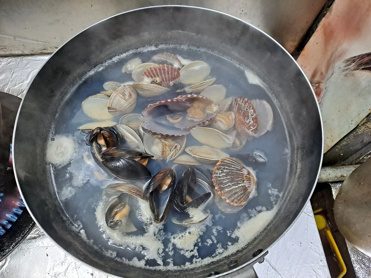 소래포구 어시장에서 산 백합, 가리비, 홍합, 동죽을 넣고 육수를 낸다. 가게의 강한 화력으로 한소끔 끓여 거품은 걷어낸다. 뽀얗고 시원한 감칠맛의 육수다.