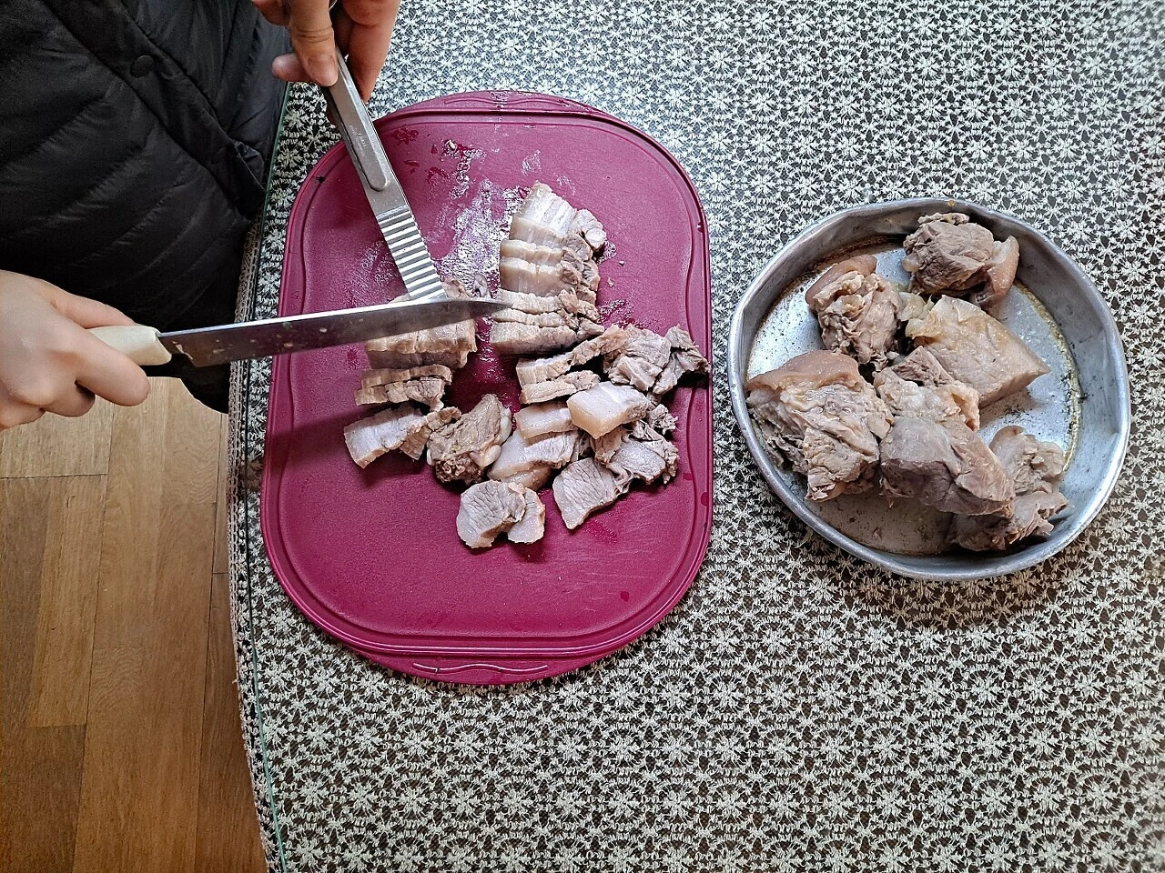 잘 삶아진 수육을 건져 도마에 얹고 도톰하게 썬다. 짙은 황토색 집된장의 기운을 오롯이 흡수한 갈빛 돼지 수육을 하얀 접시에 담는다. 김장이 끝나고 식구끼리 먹을 돼지고기 수육이 완성된다.