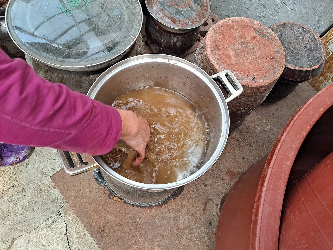 어머니가 항아리속 집된장을 떠 맹물에 넣고 휘휘 손으로 젓는다. 수육 삶는 물에 바탕이 되는 된장에 손맛이 더해진다.