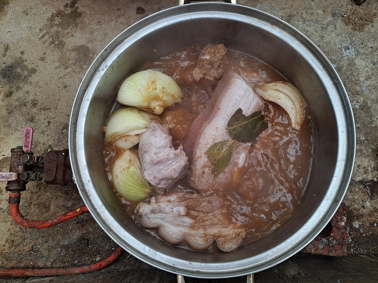 집된장을 푼 물에 삼겹살, 목살, 전지 등 돼지고기와 월계수 잎, 양파, 생강, 소주 등을 넣은 후 센 불로 끓이다가 약한 불로 줄여 은근하게 삶아낸다. 양파가 뭉근해지고 돼지고기를 젓가락으로 찔러 푹 들어가고 핏기도 보이지 않으면 알맞게 잘 삶아진 거다.