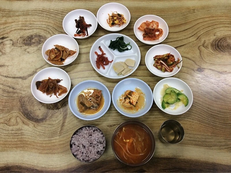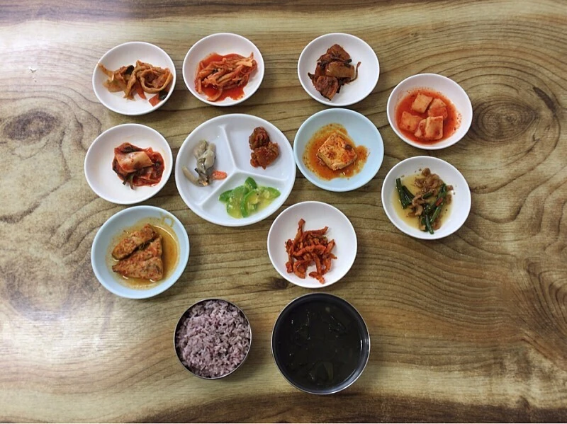 식탁에 10여 가지 이상 찬이 골고루 차려진다. 어묵볶음, 무생채, 열무김치 볶음, 깍두기, 김치, 버섯, 오이지무침, 애호박나물, 두부조림, 무말랭이무침, 건새우를 넣은 마늘종 조림, 파김치, 콩나물무침, 겉절이, 시금치나물, 무장아찌, 두부조림, 고등어조림 등 식자재 수급에 따라 밑반찬은 조금씩 달라지는 듯하다.