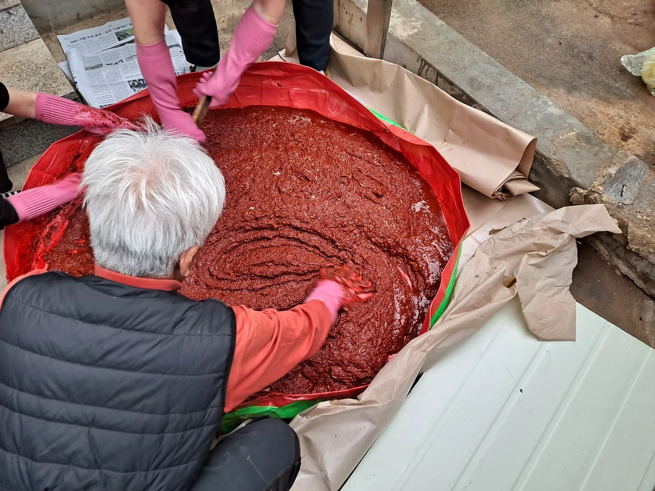 기본양념에 새우젓, 달여서 식힌 황석어젓, 멸치 액젓, 간수 뺀 굵은 천일염, 매실액, 설탕, 썰어 둔 갓, 쪽파 등 재료를 모두 넣고 골고루 섞는다. 간을 봐가며 멸치 액젓, 소금, 설탕 등은 추가한다. 기본양념에 여러 재료를 넣어 간을 맞춘 김장 양념이 준비되었다. 김치 담그는 일만 남았다.