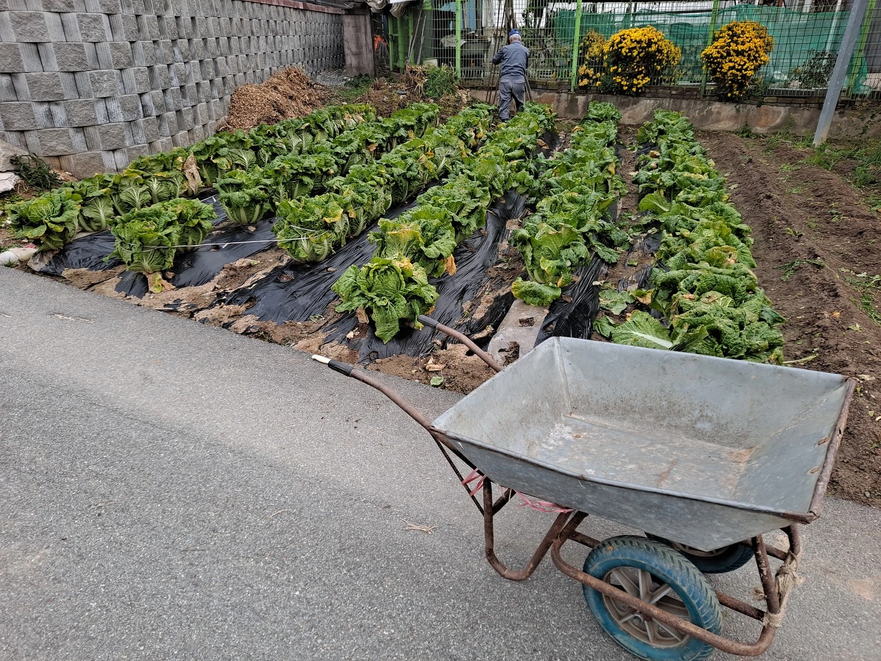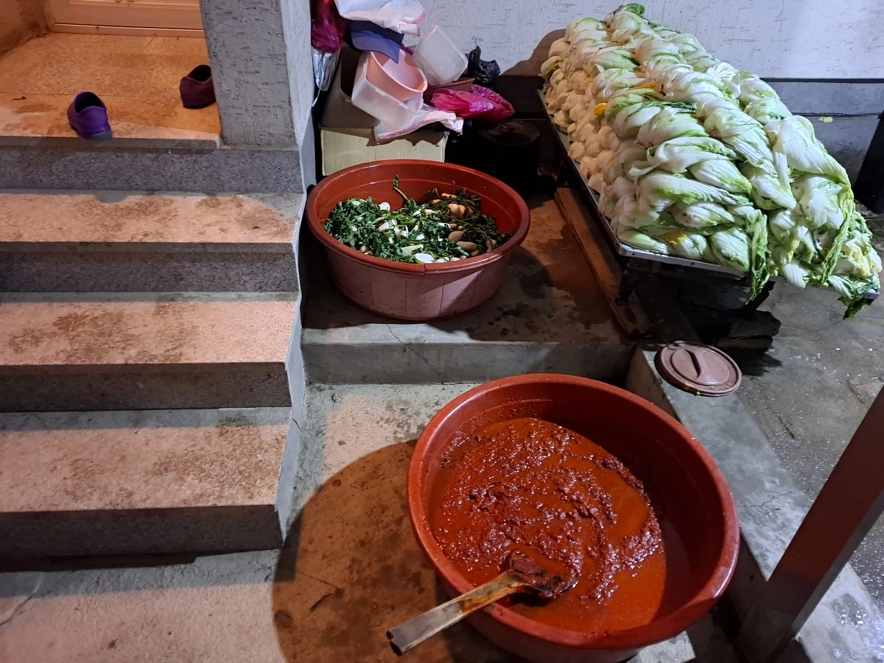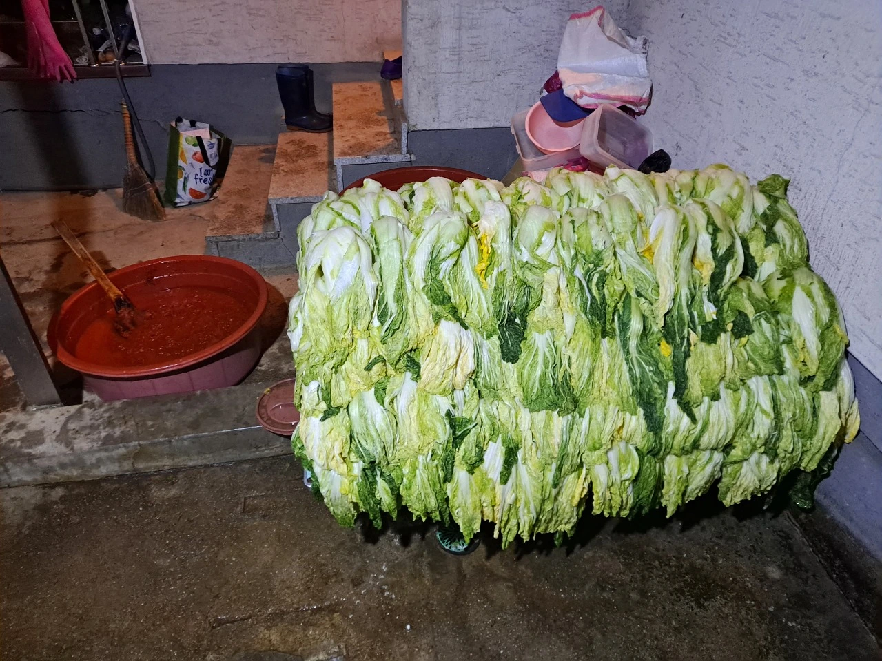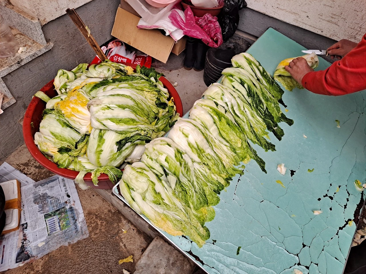 김장하는 날 아침 6시쯤의 모습이다. 탁자 위에는 텃밭에서 뽑은 배추를 깨끗이 씻어 가르고, 천일염을 넣은 소금물에 하루 절인 후 물기를 꽉 짠 절임 배추가 차곡차곡 쌓여 있다. 탁자를 약간 기울게 한 건 물기가 빠지게 하기 위함이다.