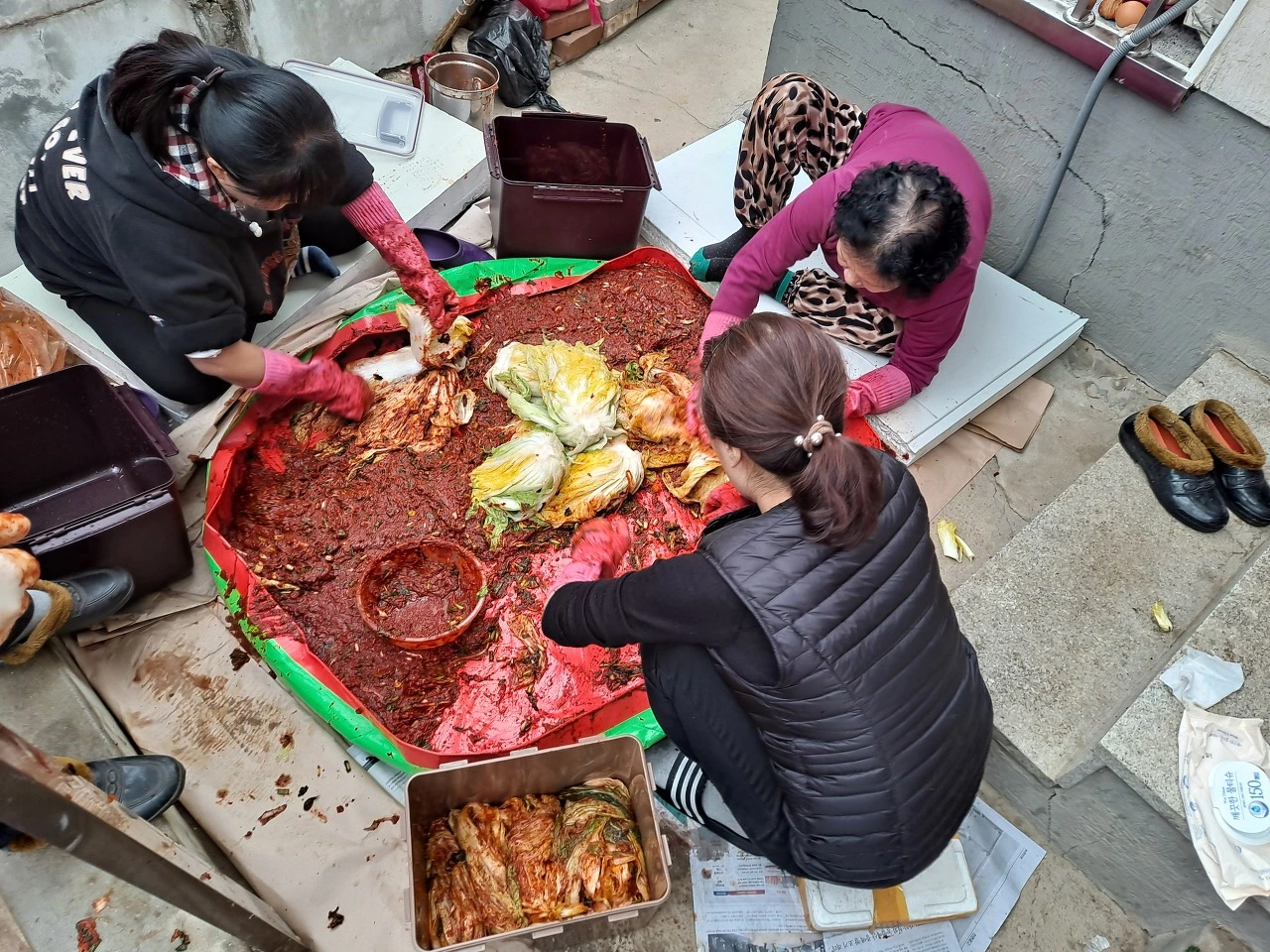 소금물에 절여 물기를 뺀 절인 배추 꽁다리를 손질해 김칫소가 담긴 매트에 넣어 준다. 절인 배추에 김칫소를 차곡차곡 꼼꼼히 넣은 뒤 배추를 접고 겉잎으로 배추를 감싼다. 담근 배추를 절단면이 위로 가게 꼭꼭 눌러 통에 담고 우거지로 맨 위에 덮는다. 김장의 끝이 보인다.