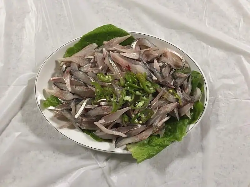전어회를 주문한다. 하얀 접시에 상추를 깔고 전어를 길쭉하게 썰어 얹은 후 썬 고추를 올린 전어회가 식탁 중앙에 놓인다.