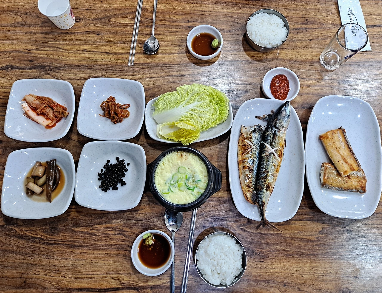 갓 지은 쌀밥에 배추겉절이, 오독오독 씹히는 오이지무침, 단단하고 짭짤한 콩조림, 양파·마늘종 장아찌. 보드라운 달걀찜, 생배추, 쌈장, 고추냉이 넣은 간장 양념 등 밑반찬을 곁들여 먹는다.