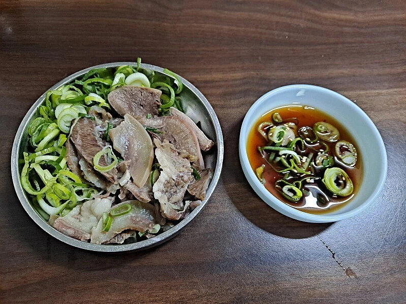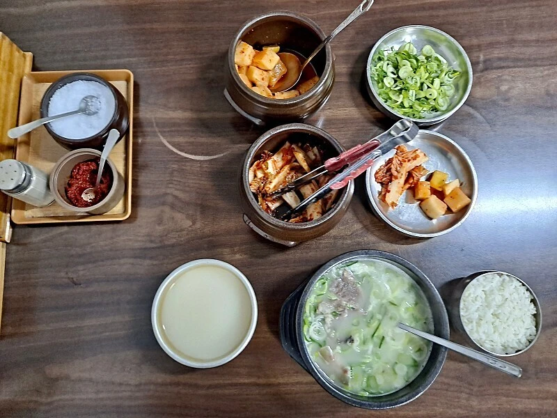 곁들여 나온 썬 대파에 설렁탕 속 소머릿고기를 건져 함께 양념간장에 찍어 먹는다. 양념간장의 감칠맛, 알싸한 대파, 수육의 풍미와 다양한 질감으로 입안이 흥건해진다. 막걸리 한잔으로 흥건해진 입안을 깨끗이 내장으로 내려보낸다.
