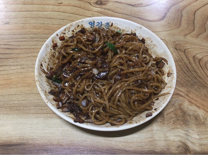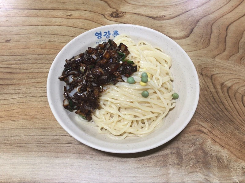 적당량의 간짜장 양념을 면에 붓고 잠시 눈으로 즐긴다. 하얀 면, 검은 양념, 노란 옥수수, 푸른 완두콩 등 색감이 곱다. 하얀 그릇에 새겨진 '영강춘' 푸른 글씨는 음식을 보듬으며 멋과 맛을 담는다.