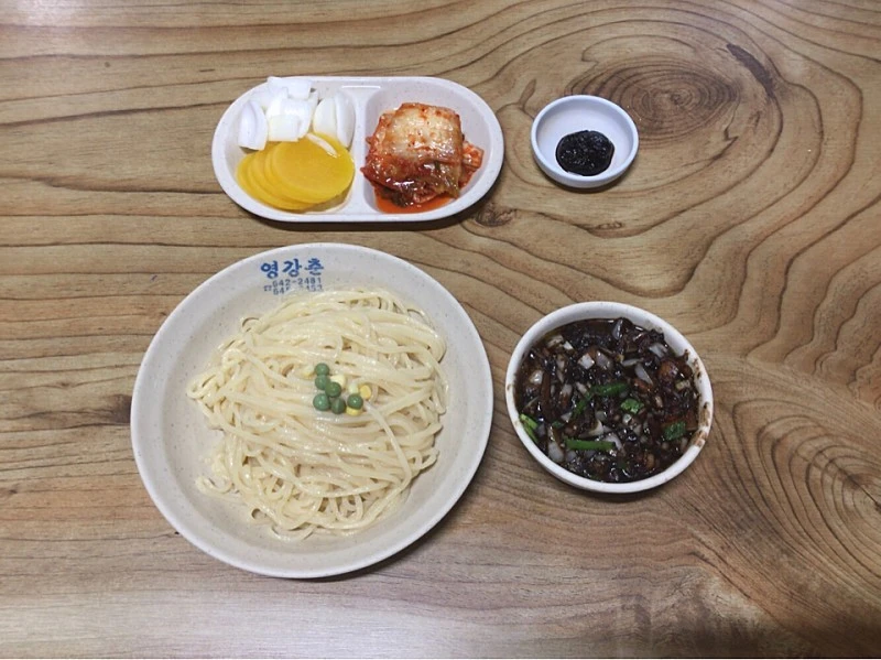 ‘영강춘’이 쓰인 그릇엔 첨가제 사용 없어 보이는 새뽀얀 면을 담고 푸른 완두콩, 노란 옥수수알을 올렸다. 주문 후 채소와 춘장을 넣어 볶아낸 간짜장 양념에선 모락모락 김이 올라온다. 갓 만든 음식의 따뜻함은 코로 향을 전한다. 향은 뇌로 전해지고 뇌는 침샘을 자극한다. 손은 뇌의 명령을 재빨리 눈치채고 간짜장 양념을 면에 들이붓는다. 손으로 만든 즉석 음식은 손님의 오감을 자극한다.