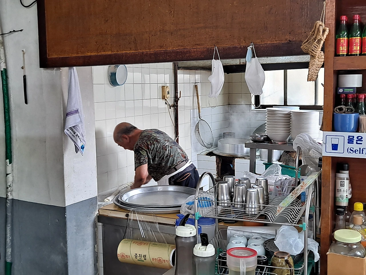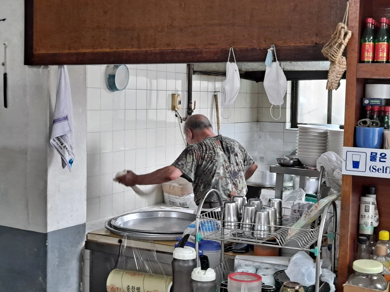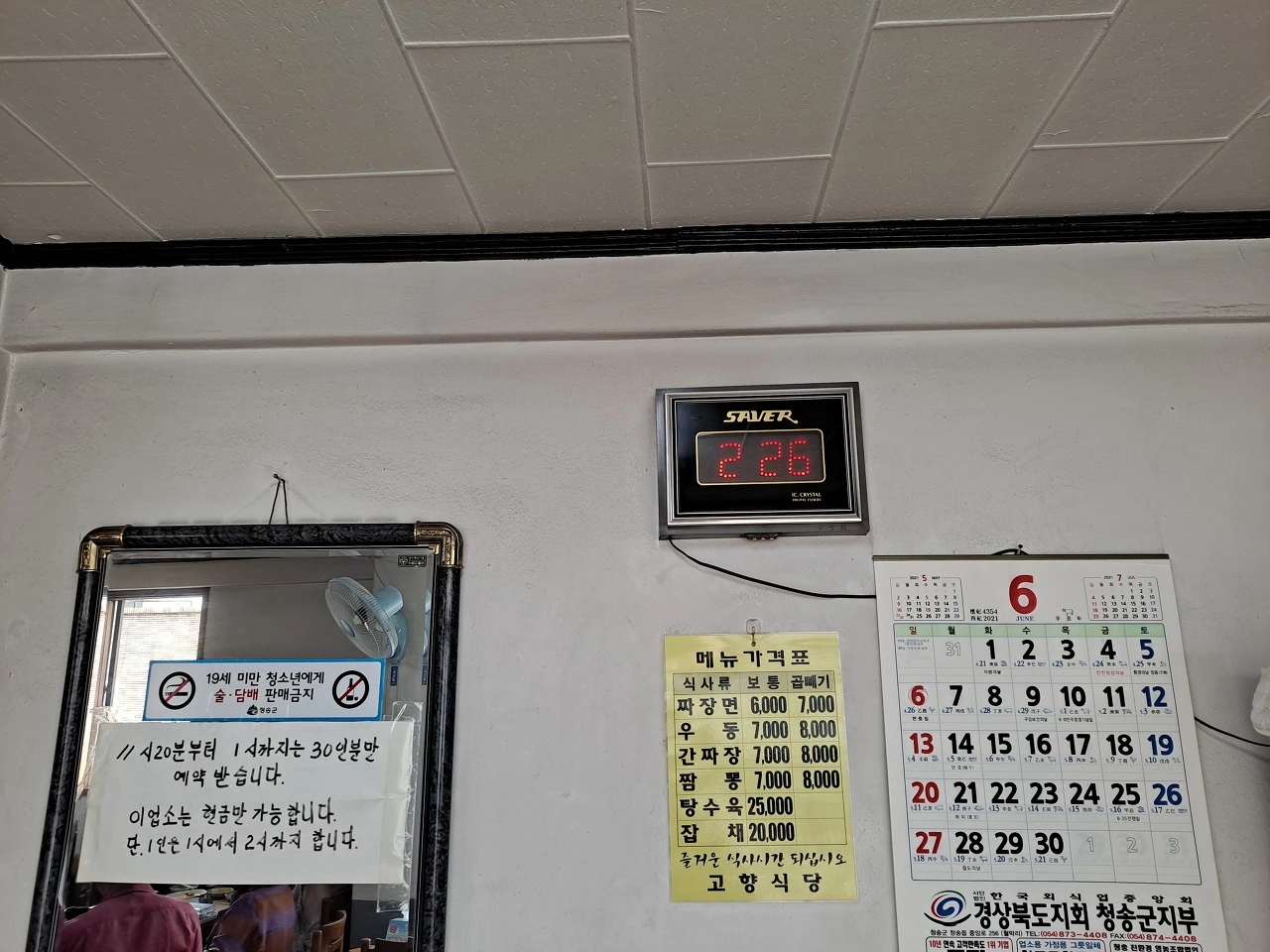 식당 거울에 "11시 20분부터 1시까지는 30인분만 예약받습니다. 이 업소는 현금만 가능합니다. 단 1인은 1시에서 2시까지 합니다."란 글이 쓰인 종이가 붙어 있다. 바쁠 때는 음식도 통일해야 하고 탕수육 같은 요리 주문도 되지 않는다.