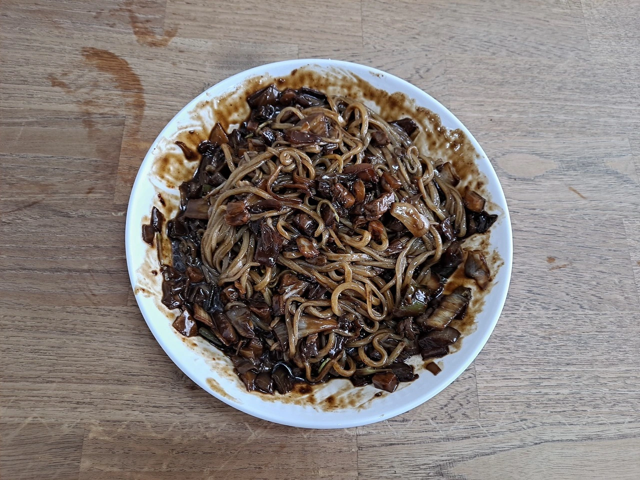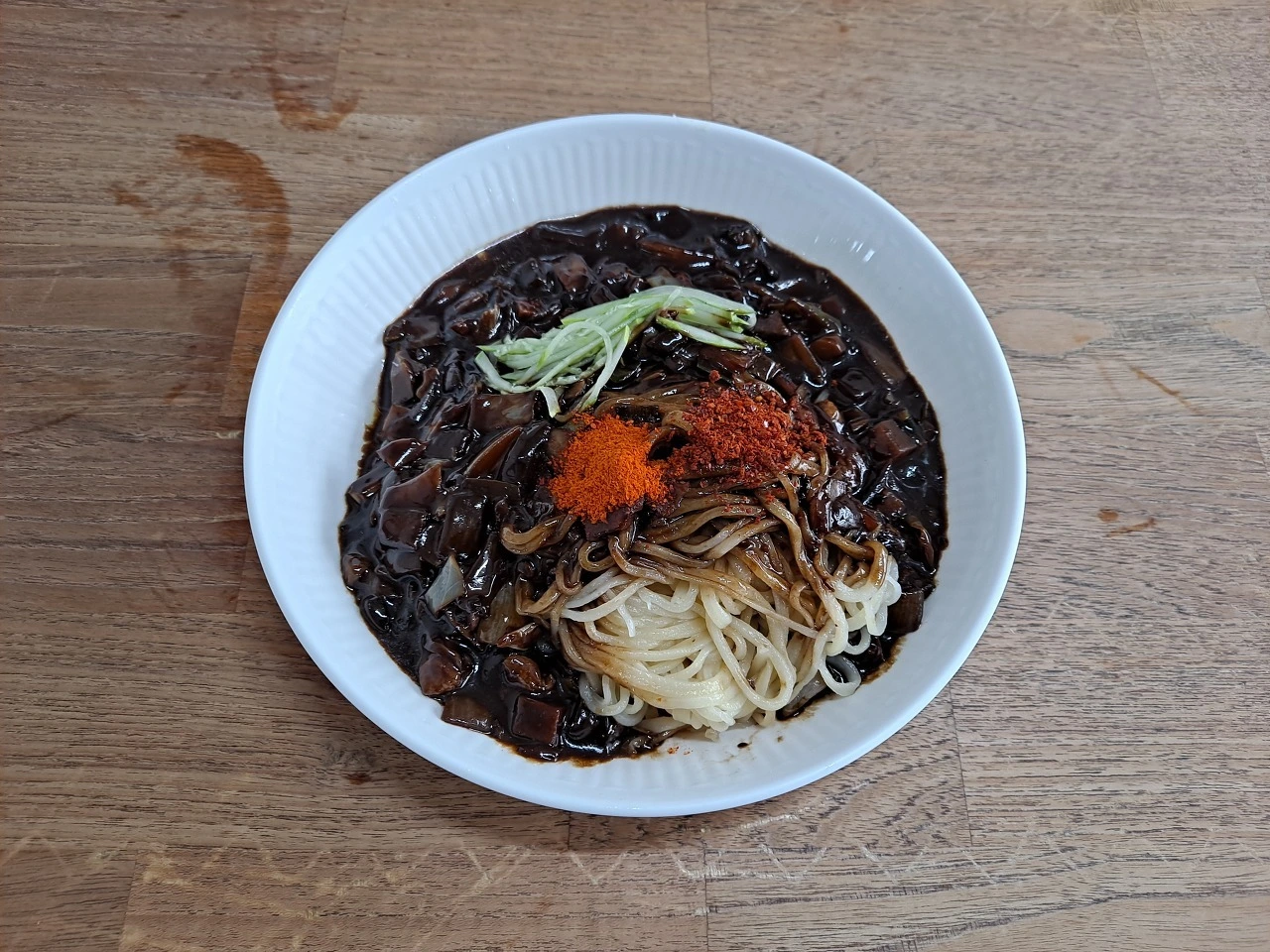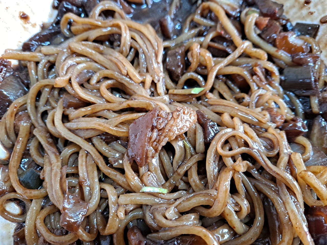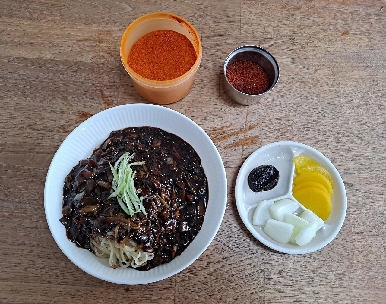 굵은 고춧가루와 고운 고춧가루를 적당히 뿌린 후 따뜻한 짜장 양념이 잘 섞이게 비빈다. 끓여둔 짜장 양념이 아닌 간짜장 양념처럼 볶은 양념장이다. 짠맛보단 단맛이 좀 더 나는 춘장에 채소의 숨이 살짝 죽을 정도로만 볶았다. 감자, 양파, 호박, 파 등 채소의 식감과 맛이 오롯이 살아 있다.고소한 풍미를 눈으로 확인한다.