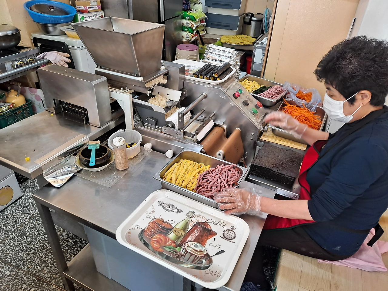 내부에 김밥 싸는 기계가 보인다. 김을 깔아주면 알아서 밥이 나와 얇게 깔리고 김밥 속 재료를 넣으면 자동으로 척척 말아낸다. 말려진 김밥도 기계가 고른 크기로 썰어준다. 기계가 도깨비 망방이다.