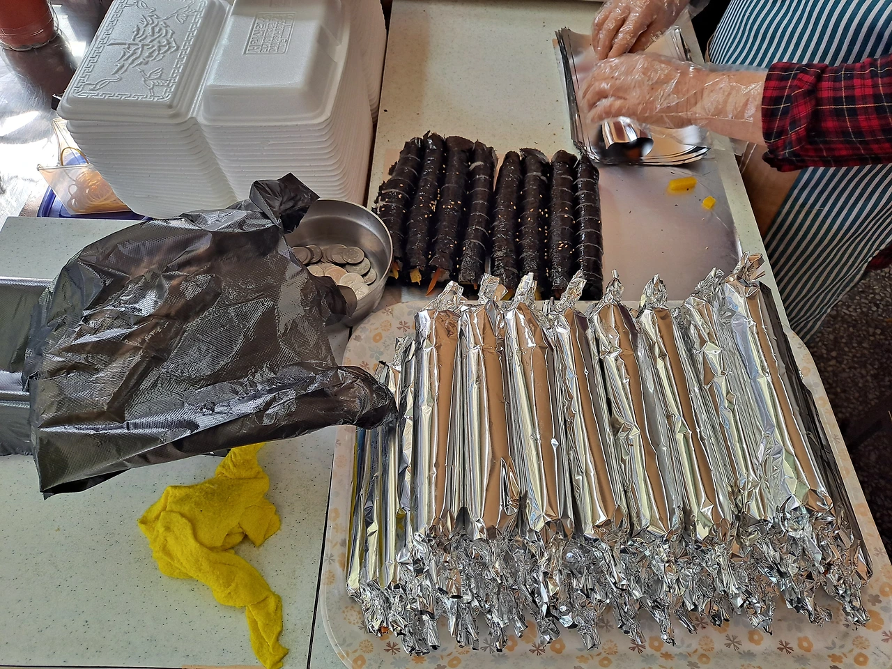 기계 덕분에 많이 편해졌지만, 속 재료를 준비하고 김밥에 넣고 포일에 싸는 작업은 여전히 사람의 몫이다. 3분의 어르신들 손길은 쉴 틈 없이 분주하다.