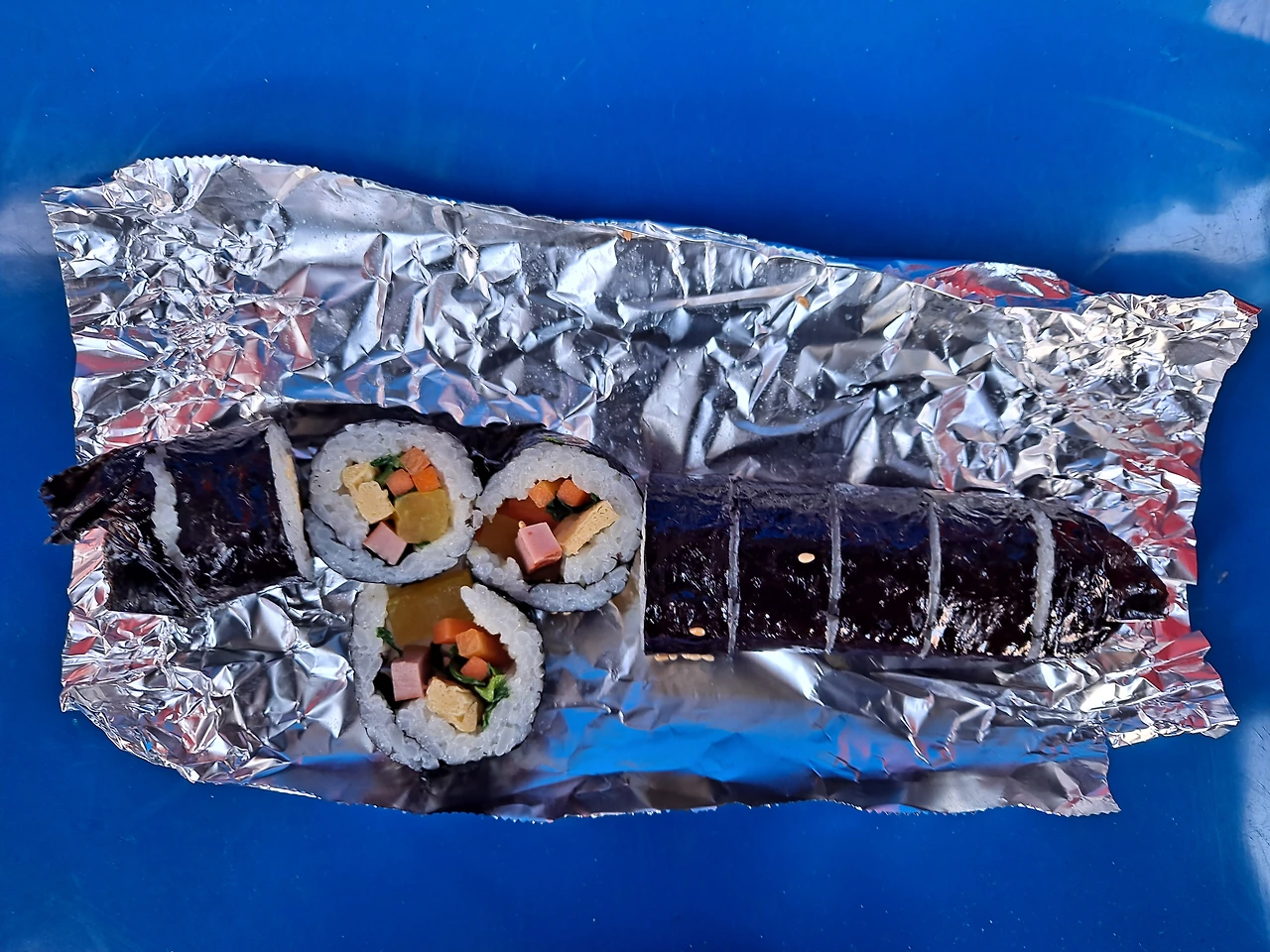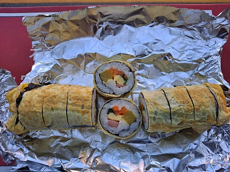 일반 김밥은 김에 찰지고 촉촉한 밥을 깔고 단무지, 햄, 달걀지단, 당근, 시금치 등 꼭 들어가야 할 몇 가지만 속 재료로 넣었다. 다 싼 김밥에 참기름을 살짝 바르고 깨를 뿌렸다. 계란 김밥은 달걀옷만 입혔을 뿐 속 재료와 크기가 일반 김밥과 다르지 않다.