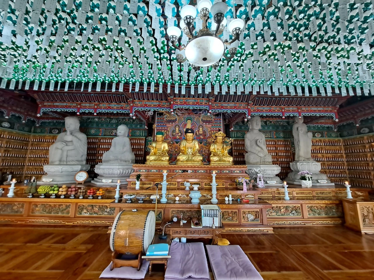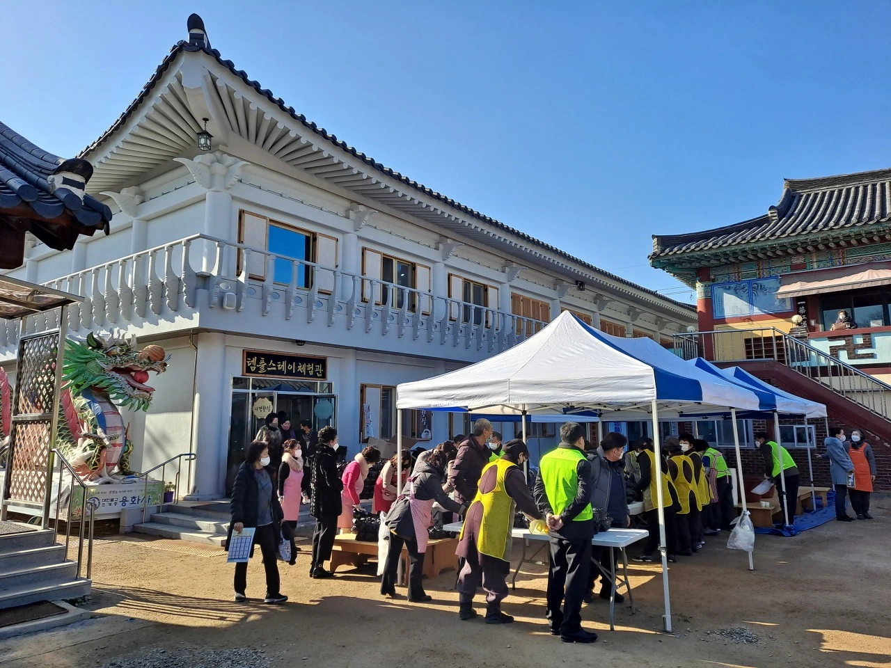 12월 동짓날 청주 용화사를 찾는다. 열 체크와 코로나 19 접종 확인 등을 거친 후 공양간으로 간다. 공양간 앞에서는 자원봉사자 분들과 불자분들이 팥죽을 그릇에 담고 봉지로 포장해 대중들에게 나눠준다. 일반인들, 예불 끝난 불자분들이 포장된 팥죽을 들고 가신다. 동짓날 사찰 팥죽 공양의 모습이다.