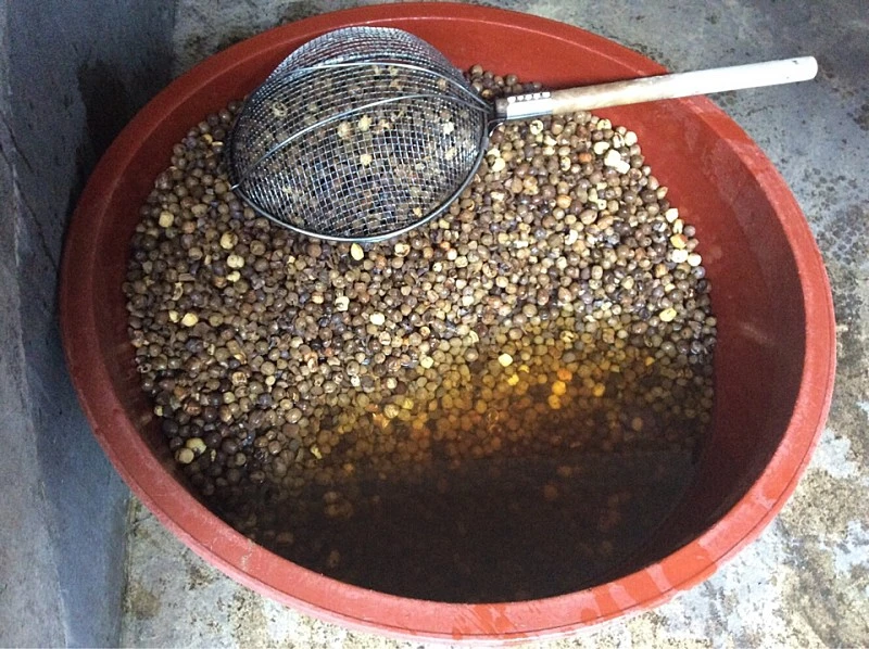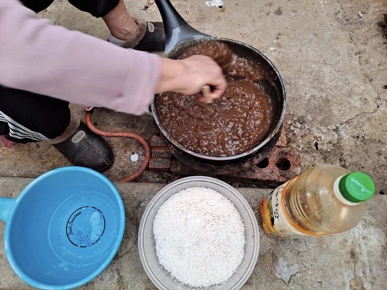 물에 불린 도토리를 건져 방앗간에서 갈아온다. 도토리 가루를 쌀 포대에 넣고 물을 부어 준다. 떫은맛을 일정 정도 없앤다. 빨간 대야 속 물은 검고, 쌀 포대 속 도토리 가루는 짙은 갈색빛을 띤다.