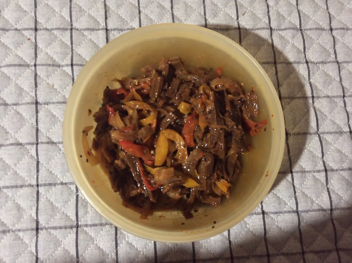 채 썬 말린 도토리묵나물을 끓는 물에 불려 삶은 물에 데쳐 낸 후 간장, 매실액, 참기름, 깨, 청·홍 피망 등을 넣고 식용유에 볶는다. 떫은맛은 덜해지고 달금하고 쫀득한 식감은 더해졌다.