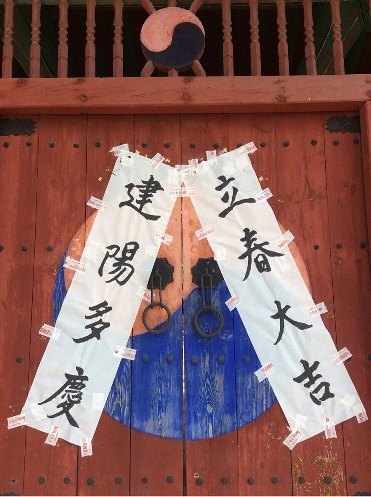 입춘첩은 봄이 온 것을 축하하거나 기원하는 글을 적은 종이로, 입춘에 집의 대문이나 기둥, 문 위에 붙인다. 대문에 가장 많이 쓰이는 문구로는 '입춘대길立春大吉’, ‘건양다경建陽多慶'이 있으며, 집안 공간의 성격에 따라 붙이는 내용이 다르다.